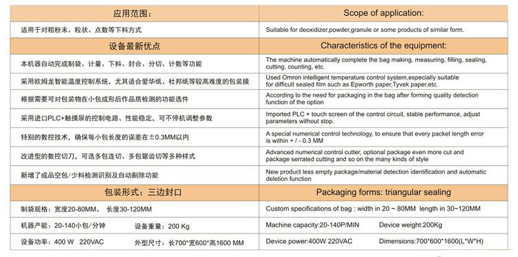 1.彩色觸摸屏和穩(wěn)定可靠的雙軸高精度輸出的PLC控制,制袋、計(jì)量、充填、封合、打碼、切袋一次完成。
